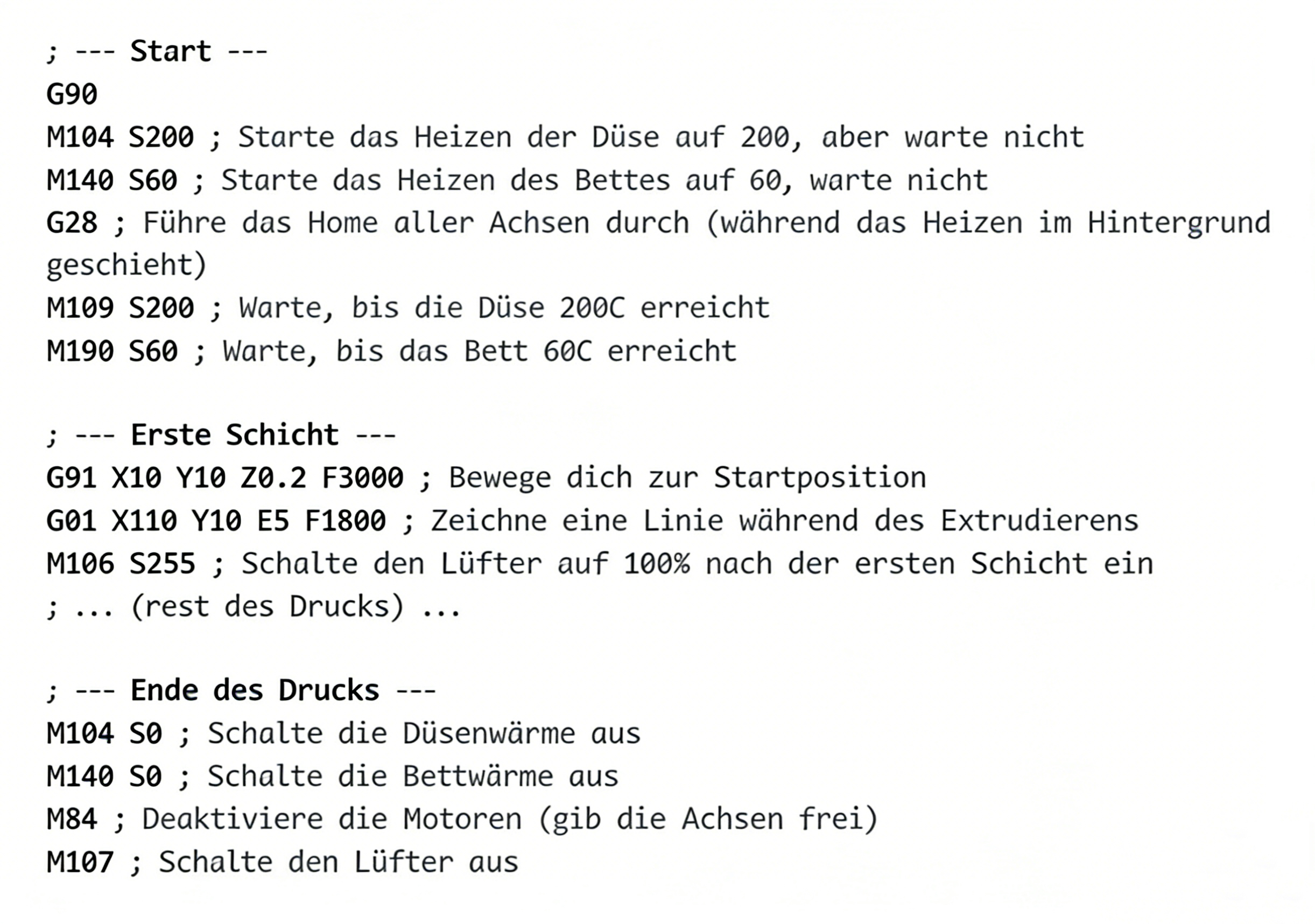 Eine G-Code Datei hat nicht immer die gleiche Struktur und kann je nach Modell etwas anders aufgebaut sein. Grundsätzlich gibt es drei Blöcke.